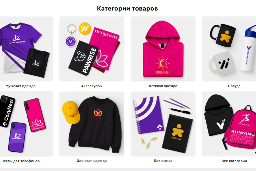 - Аксессуары: фирменные рюкзаки, сумки, бейджи, шопперы.
