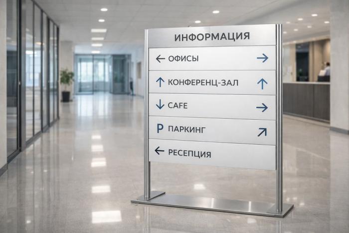 Навигационные стенды помогают ориентироваться в помещении или на территории. Их главная задача — сократить время поиска нужного кабинета, отдела или зоны.