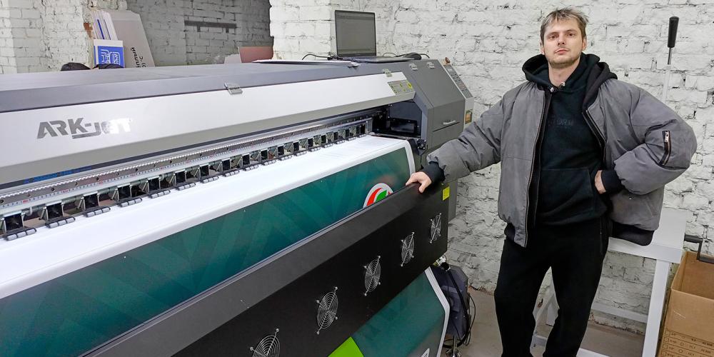 После совсем недавнего запуска планшетного УФ-принтера Sprinter DPP A1E в РПК «КЛЕВЕР» из Иванова инженер местного представительства компании «КОВЧЕГ» установил здесь экосольвентный ARK‑JET SOL 3204 шириной 3,2 м с четырьмя головками Epson i3200. Принтер с разрешением до 3600 dpi печатает с максимальной скоростью 198 м²/час и позволяет достигать высокой производительности за счет возможности печати на двух рулонах одновременно.