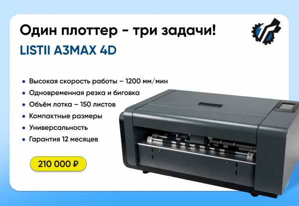 LISTII A3 MAX 4D – это профессиональный листовой плоттер с функцией автоподачи материала и системой резки и биговки за одно задание. Он создан для производителей рекламной продукции и типографий.