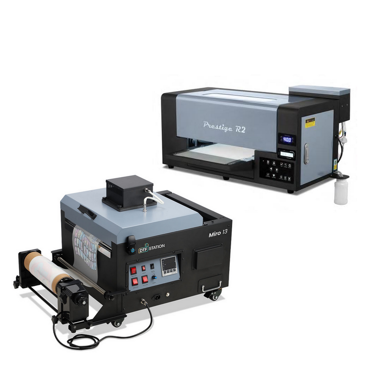 Комплекс включает в себя принтер Prestige R2 DTF и автоматический шейкер/сушку MIRO13.